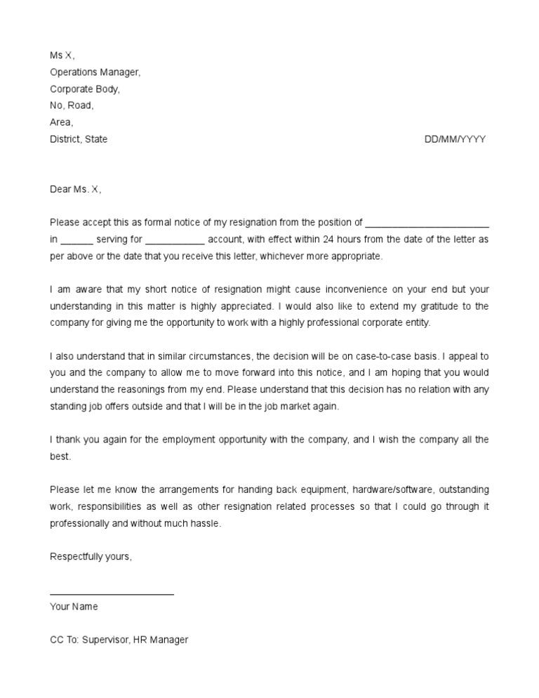 It needs to stick to the conventional organization letter template. The tone of the letter should be pleasant and friendly even if the employee is angry about leaving or doesnt like their employer. Sample resignation letter 24 hours notice.
