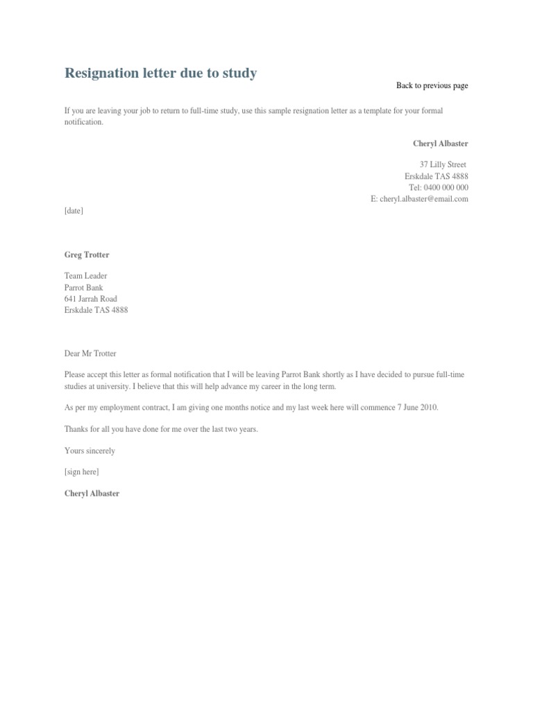 Resignation Letter Due To Study Pdf